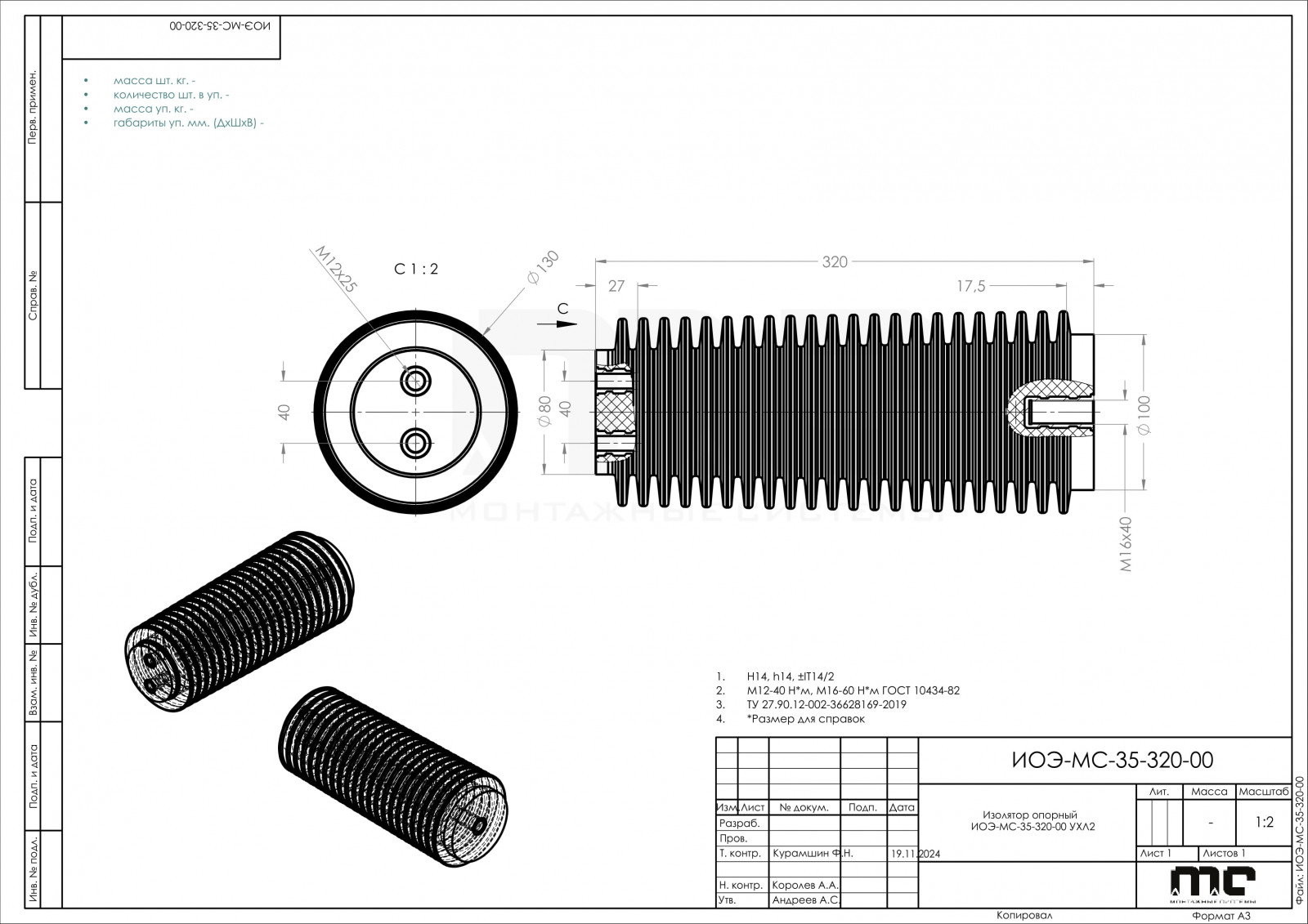 Изолятор опорный из эпоксидного компаунда , тип: ИОЭ-35-320-00.УХЛ2 предназначен для жесткого крепления и изоляции токоведущих частей в электротехнических устройствах КРУ или КСО.
