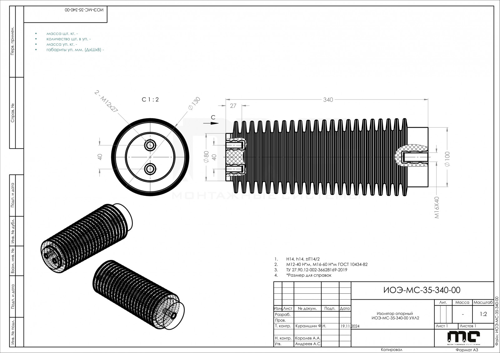 Изолятор опорный из эпоксидного компаунда, ИОЭ-МС-35-340-00 предназначен для жесткого крепления и изоляции токоведущих частей в электротехнических устройствах КРУ или КСО.