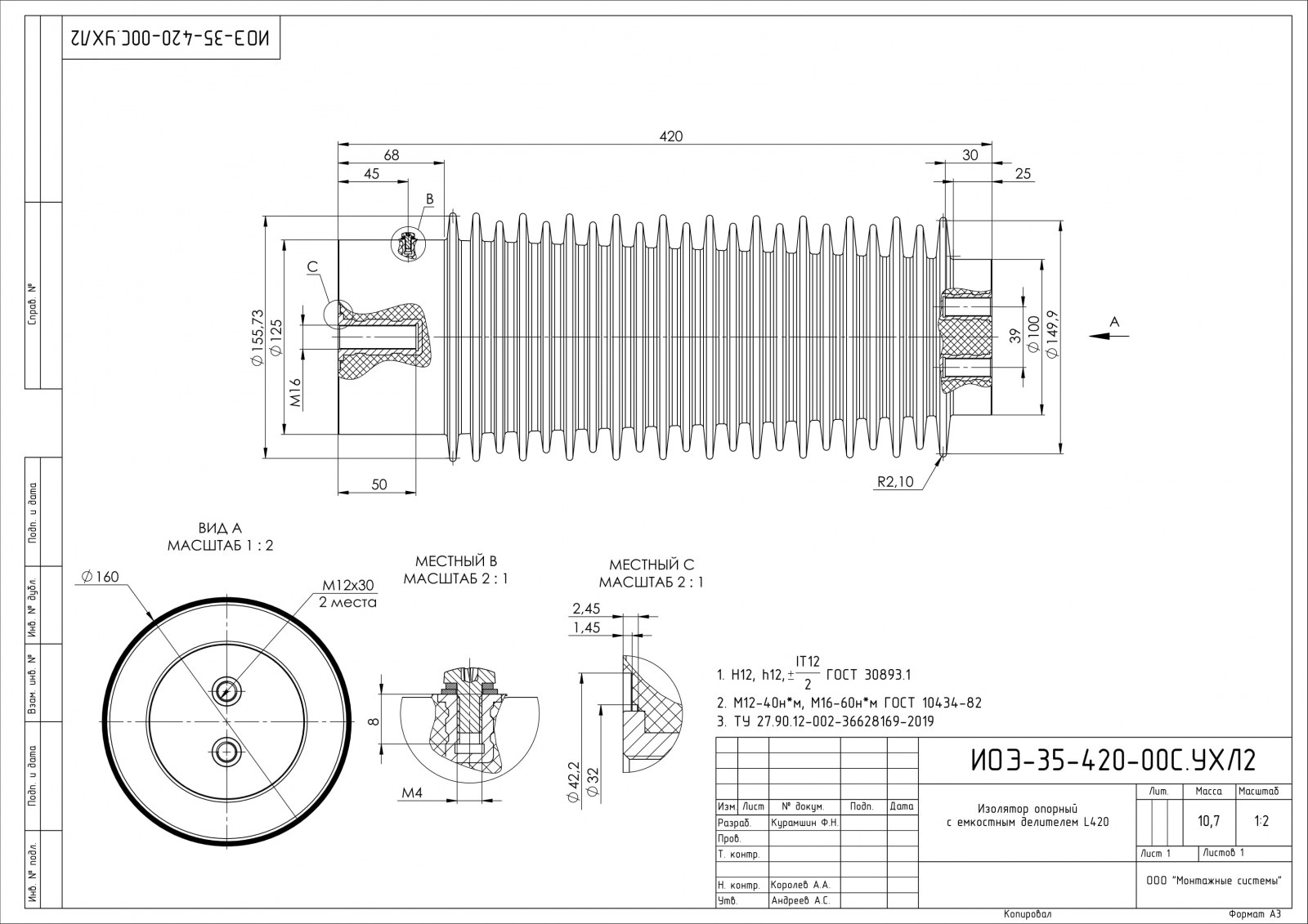 Изолятор опорный с емкостным делителем из эпоксидного компаунда , тип: ИОЭ-35-420-00С.УХЛ2 предназначен для жесткого крепления и изоляции токоведущих частей в электротехнических устройствах КРУ или КСО
