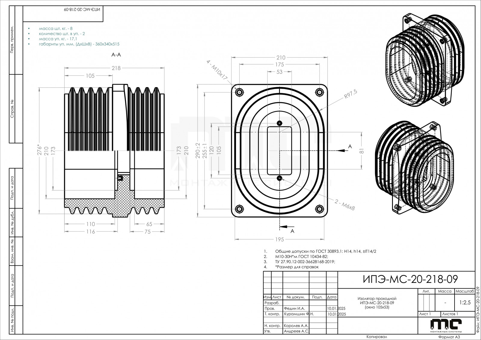 Изолятор проходной ИПЭ-МС-20-218-09 (окно 105х53)