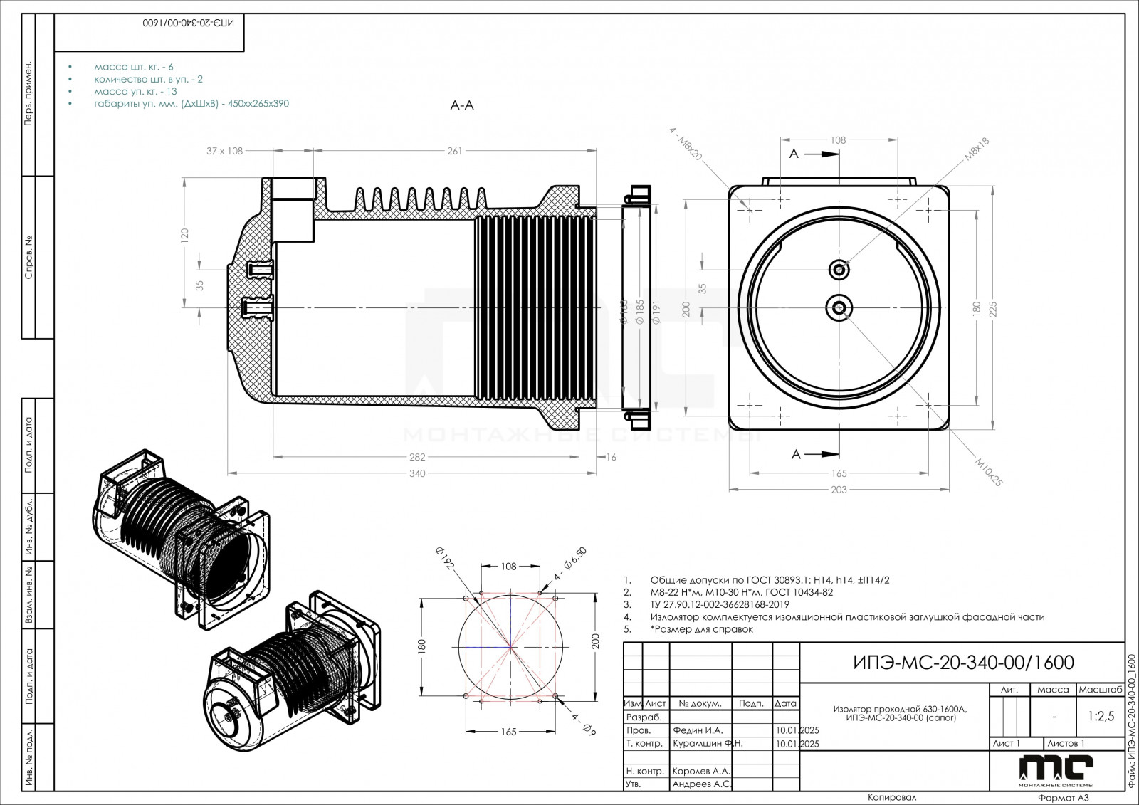 Изолятор проходной ИПЭ-МС-20-340-00, используется в ячейках КРУ 20 кВ, служит для изоляции неподвижного контакта, с одной стороны, и изоляции магистральной шины, подходящей к нему с другой стороны.