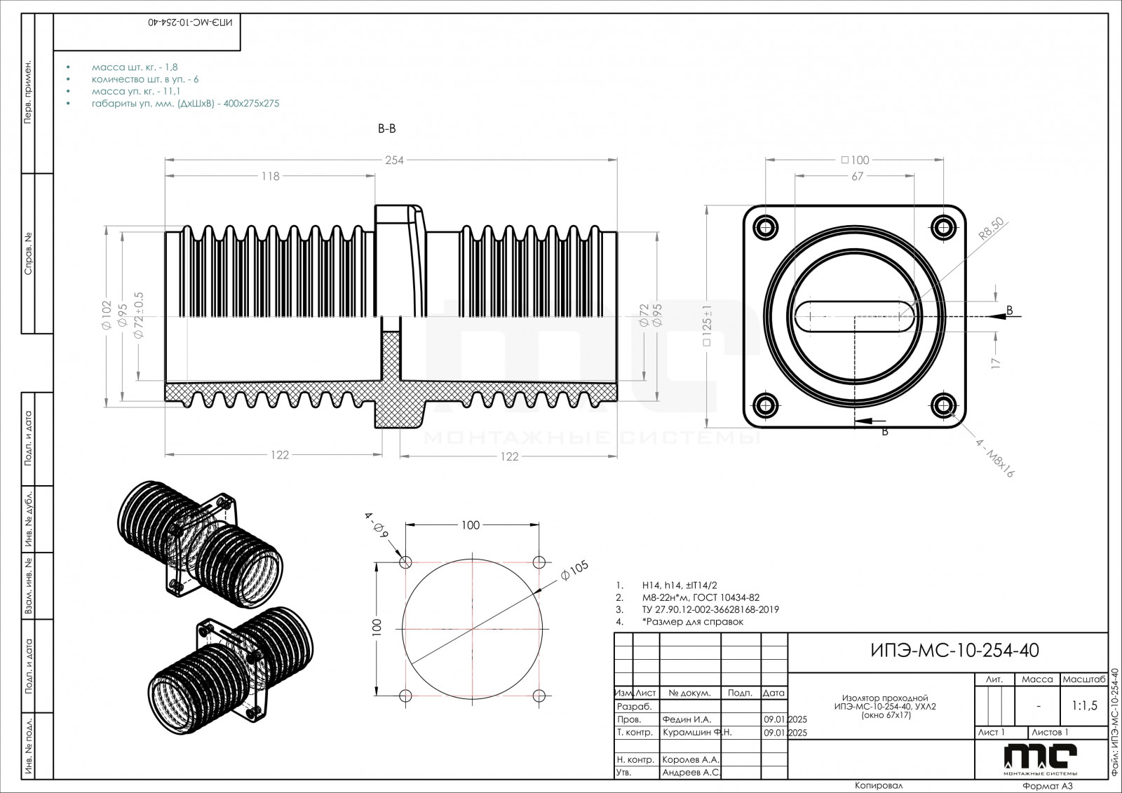 Изолятор проходной ИПЭ-МС-10-254-40, УХЛ2 (окно под шину 67х17).