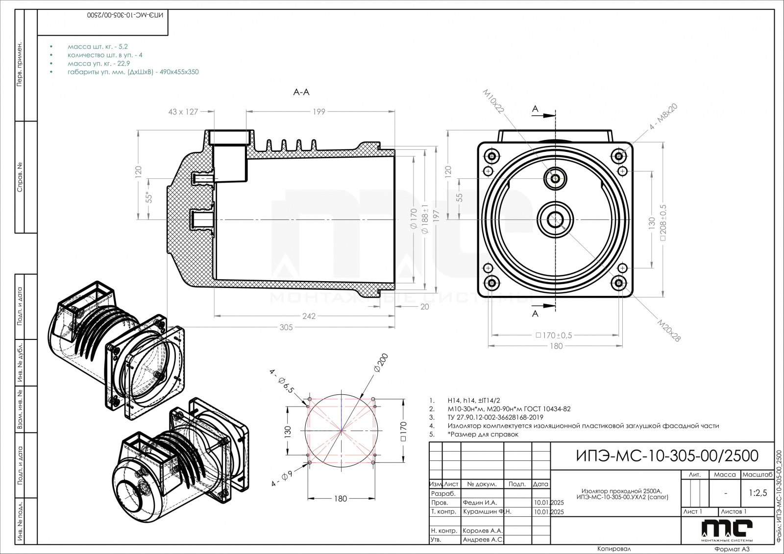 Изолятор проходной ИПЭ-МС-10-305-00/2500 служит для изоляции неподвижного контакта 2500А, с одной стороны, а с другой для изоляции магистральной шины, подходящей к нему.