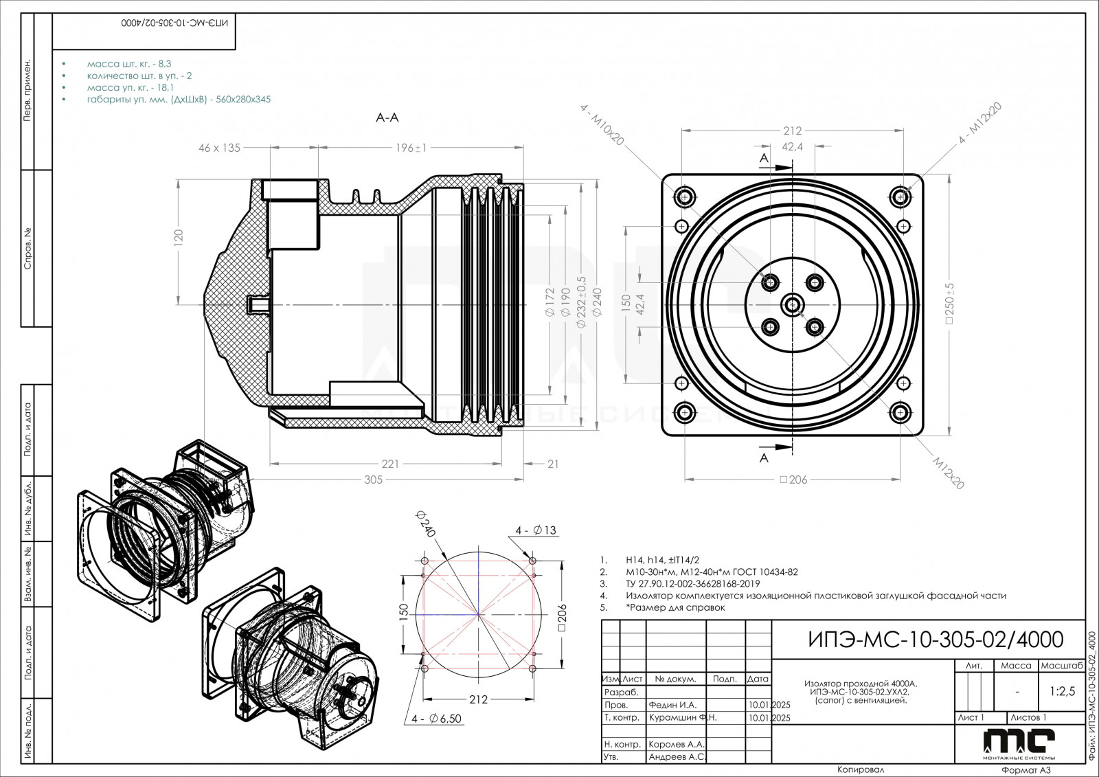 Изолятор проходной ИПЭ-10-305-02.УХЛ2 служит для изоляции неподвижного контакта 3150-4000А, с одной стороны, а с другой для изоляции магистральной шины, подходящей к нему. Устанавливается на задней стенке модуля выкатного элемента КРУ 6-10 кВ.