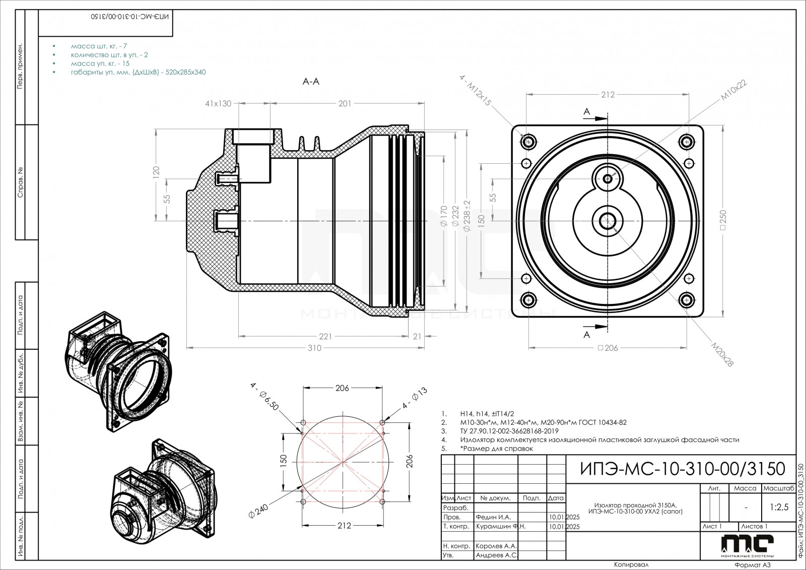 Изолятор проходной ИПЭ-10-310-00 УХЛ2 служит для изоляции неподвижного контакта 3150А, с одной стороны, а с другой для изоляции магистральной шины, подходящей к нему. Устанавливается на задней стенке модуля выкатного элемента КРУ 6-10 кВ.