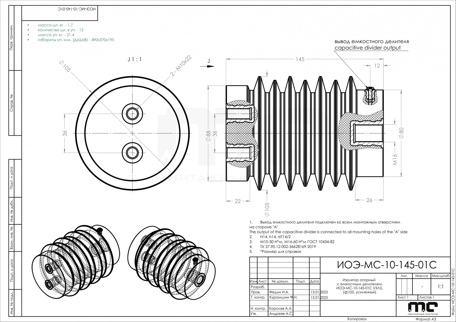 Изолятор опорный усиленный с емкостным делителем из эпоксидного компаунда, ИОЭ-МС-10-145-01С предназначен для жесткого крепления и изоляции токоведущих частей в электротехнических устройствах КРУ или КСО.