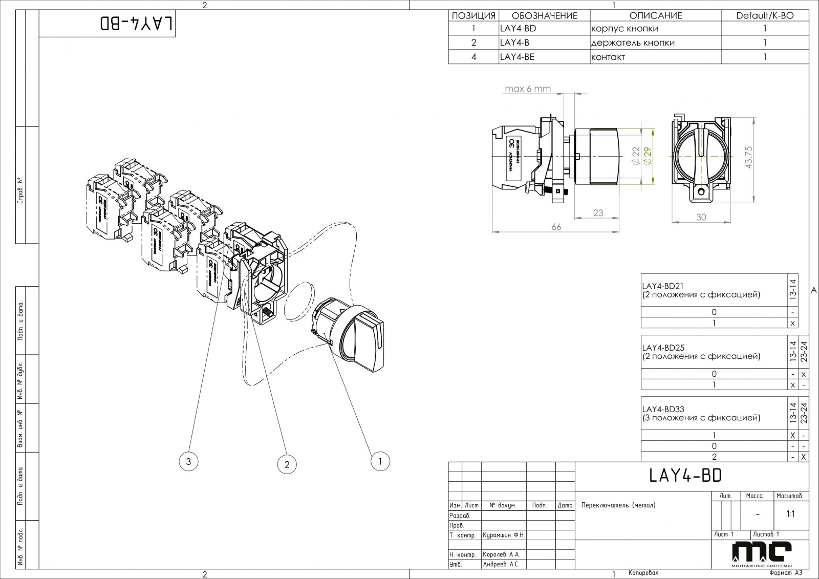 | LAY4-BD | 33 (3 положения с фиксацией) | НО+НО |