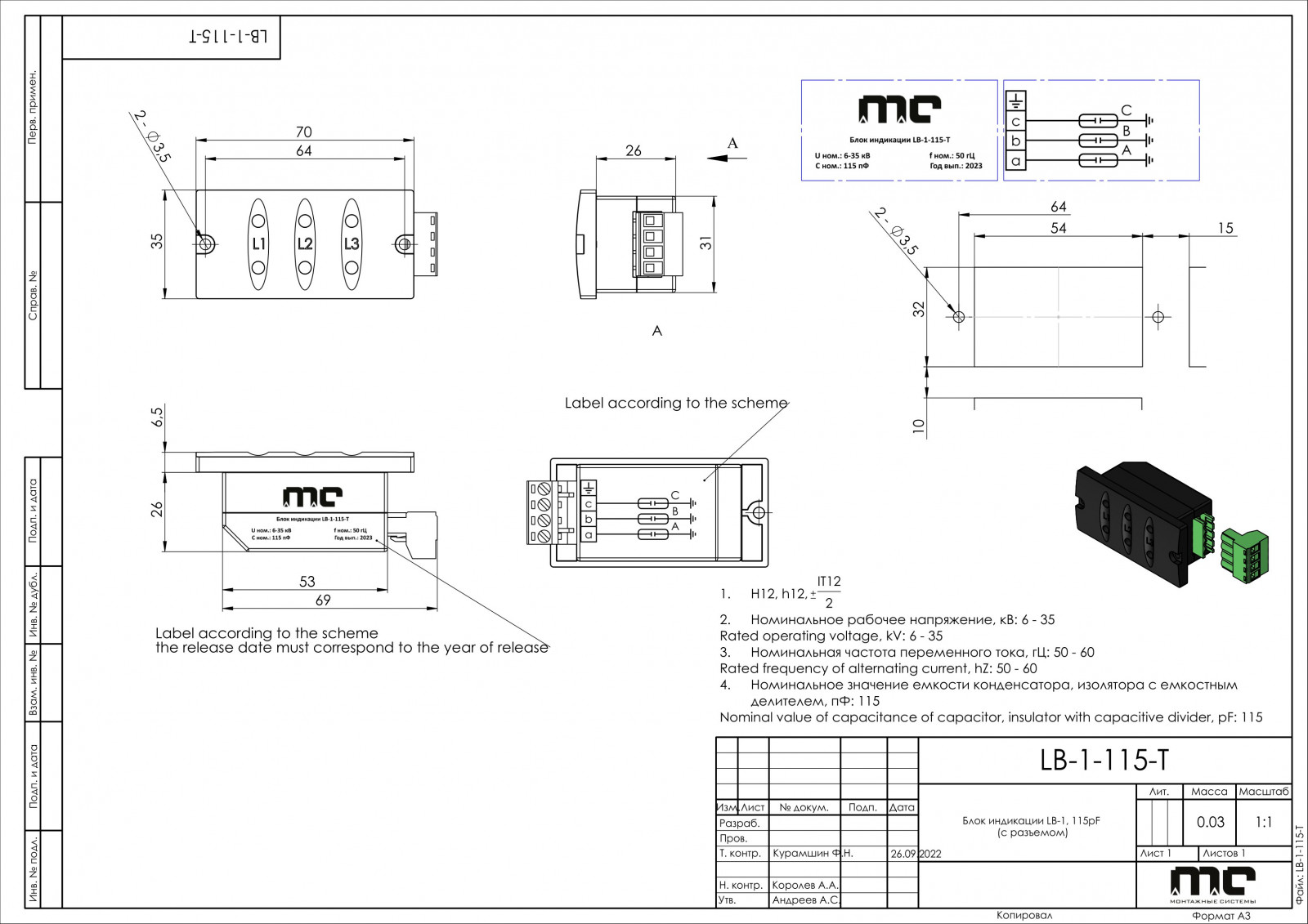 На передней панели блока выведены три светодиода, сигнализирующих о наличии напряжения на каждой из фаз соответственно, также на передней панели выведены три разъема позволяющих осуществлять контроль соединения фаз.