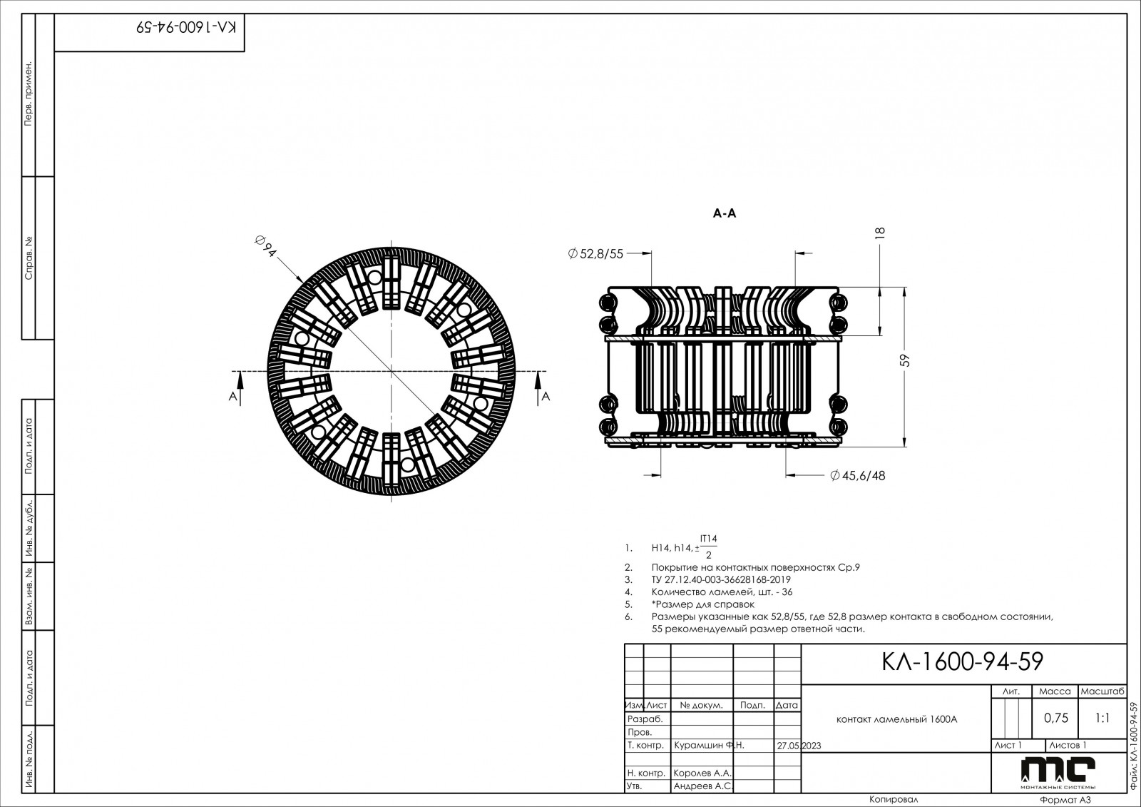 1. Номинальный ток, А - 1600