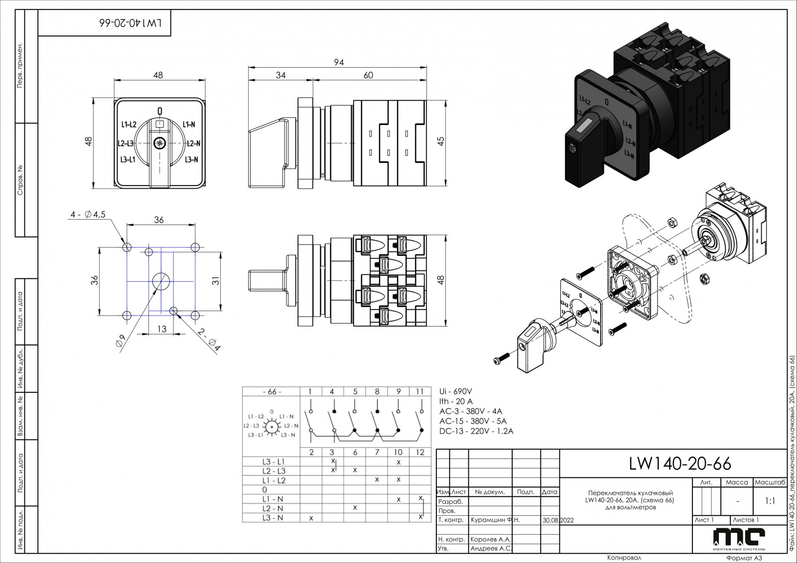 Переключатель кулачковый LW140-20-66, 20А, (схема 66) для вольтметров