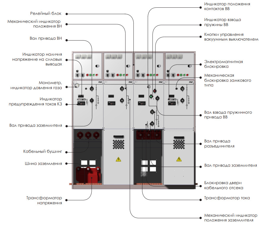 Распределительное устройство с изоляцией газом SF6/элегаз, КРУ-МС-Э (далее - РУ), устройство предназначенное для установки в радиальных, магистральных и петлевых распределительных сетях 6, 10, 20кВ., выполняет функции присоединения, питания и защиты одного или двух распределительных трансформаторов.