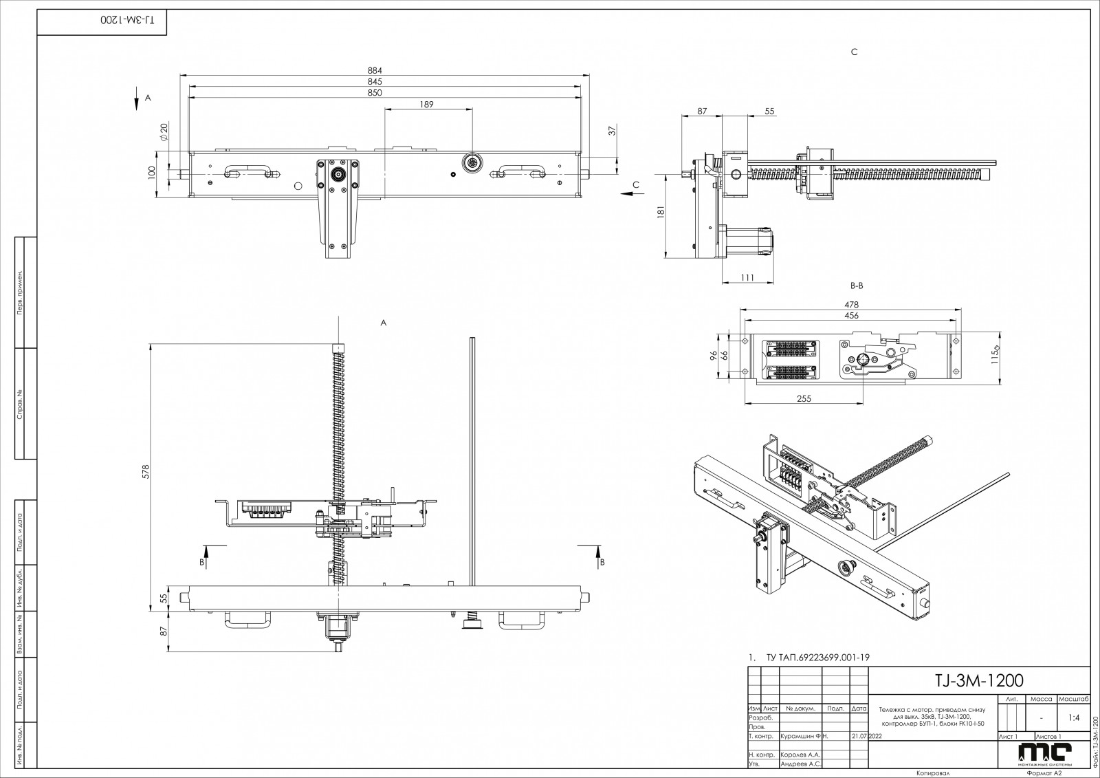 Тележка c мотор. приводом снизу для выкл. 35кВ, TJ-3М-1200, контроллер БУП-1, блоки FK10-I-50