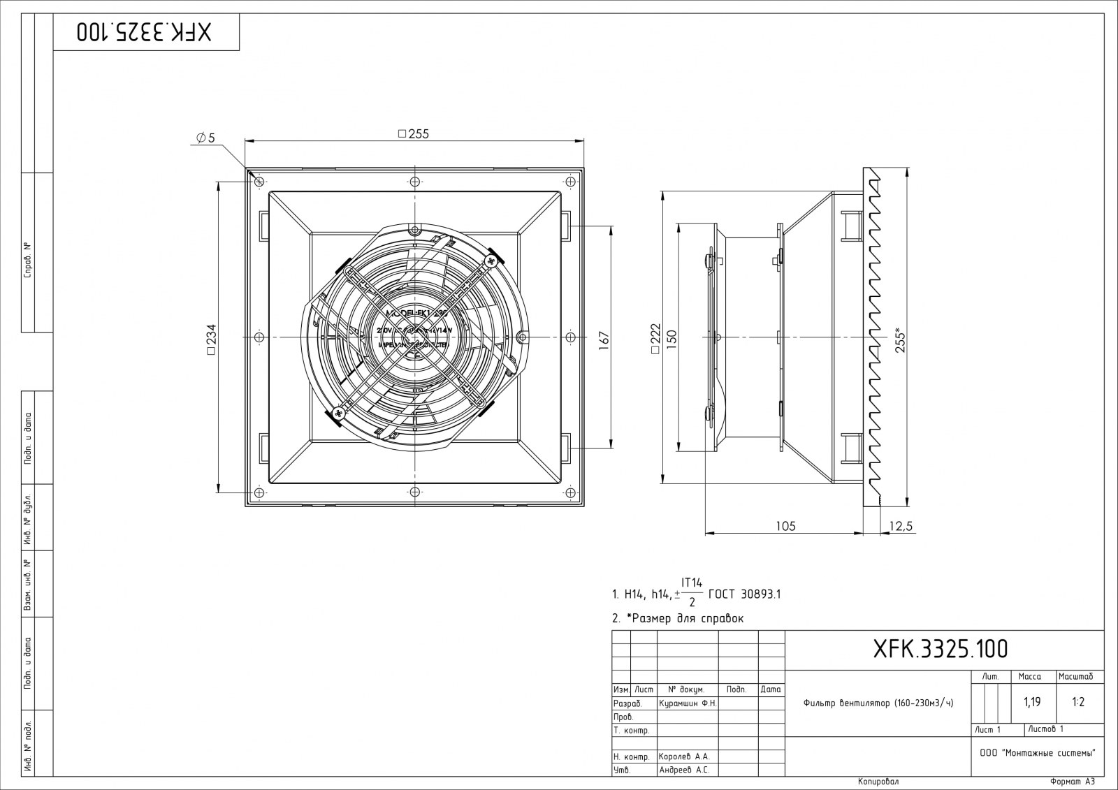 Вентилятор с фильтром XFK.3325.100 (160-230 м3/ч) 1. Напряжение питания, В: 220; 2. Потребляемая мощность, Вт: 41; 3. Номинальный ток, А: 0,28; 4. Уровень шума, дБ: 54; 5. Диапазон рабочих температур, ⁰С: от -10⁰С до +50; 6. Степень защиты: IP54