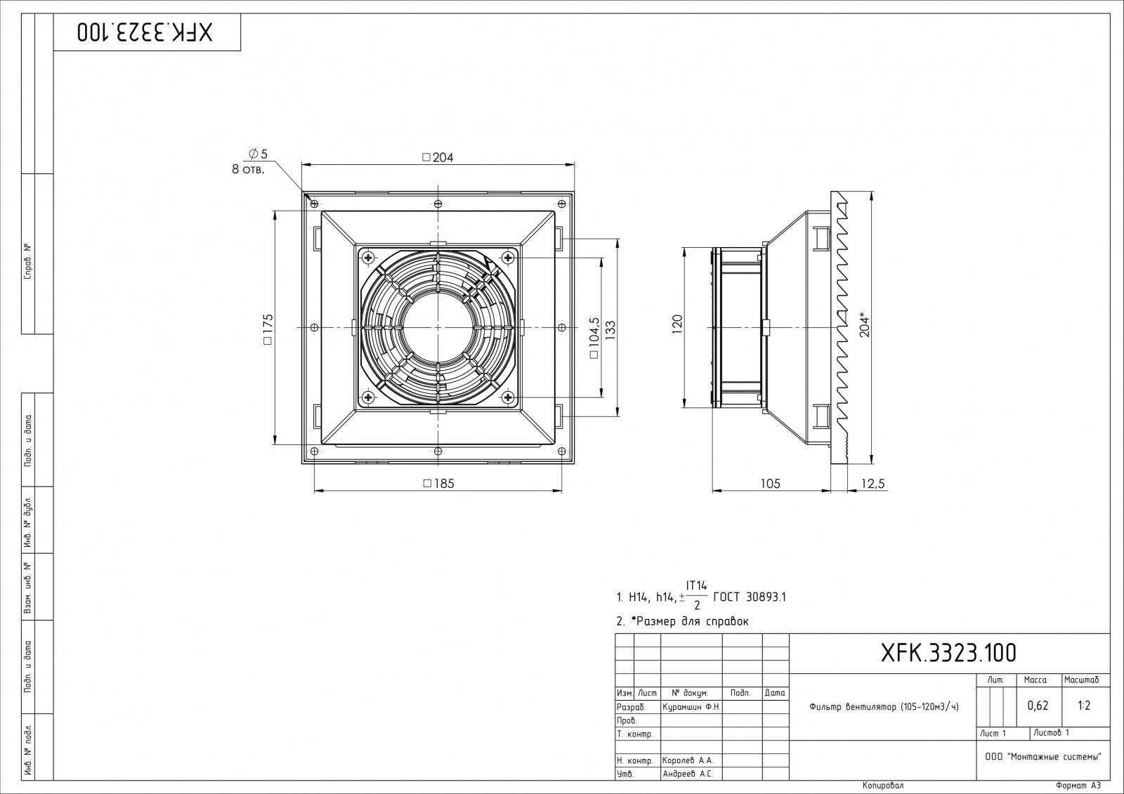 Вентилятор с фильтром XFK.3323.100 (105-120 м3/ч), экономичный аналог Rittal 3240.100, 3324.107, 3241.100, 3325.107. Вентилятор с фильтром XFK.3323.100 (105-120 м3/ч) 1. Напряжение питания, В: 220; 2. Потребляемая мощность, Вт: 19; 3. Номинальный ток, А: 0,12; 4. Уровень шума, дБ: 46; 5. Диапазон рабочих температур, ⁰С: от -10⁰С до +50; 6. Степень защиты: IP54