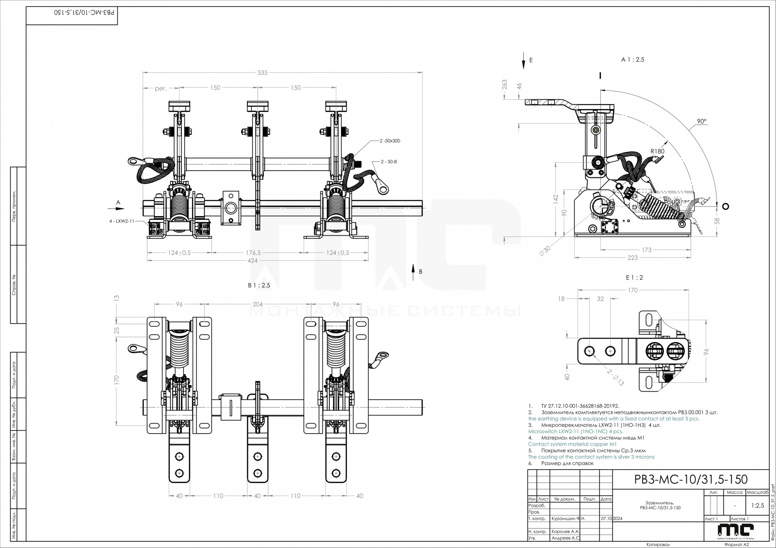 Заземлитель, тип РВЗ, предназначен для заземления выводов выключателей, разъеденителей и токопроводящих частей комплектно распределительного ил другого устройства, в сетях трехфазного переменного тока частатой 50Гц, номинальным напряжением 10кВ., с изолированной, заземленной через дугогасительный реактор или резистор нейтралью.