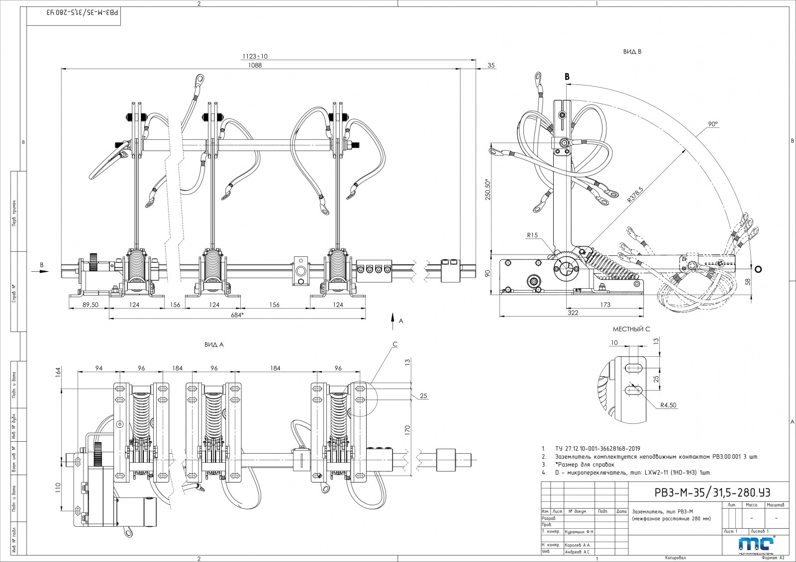 Заземлитель, тип РВЗ-M, предназначен для заземления выводов выключателей, разъеденителей и токопроводящих частей комплектно распределительного ил другого устройства, в сетях трехфазного переменного тока частотой 50Гц, номинальным напряжением 35 кВ, с изолированной, заземленной через дугогасительный реактор или резистор нейтралью.