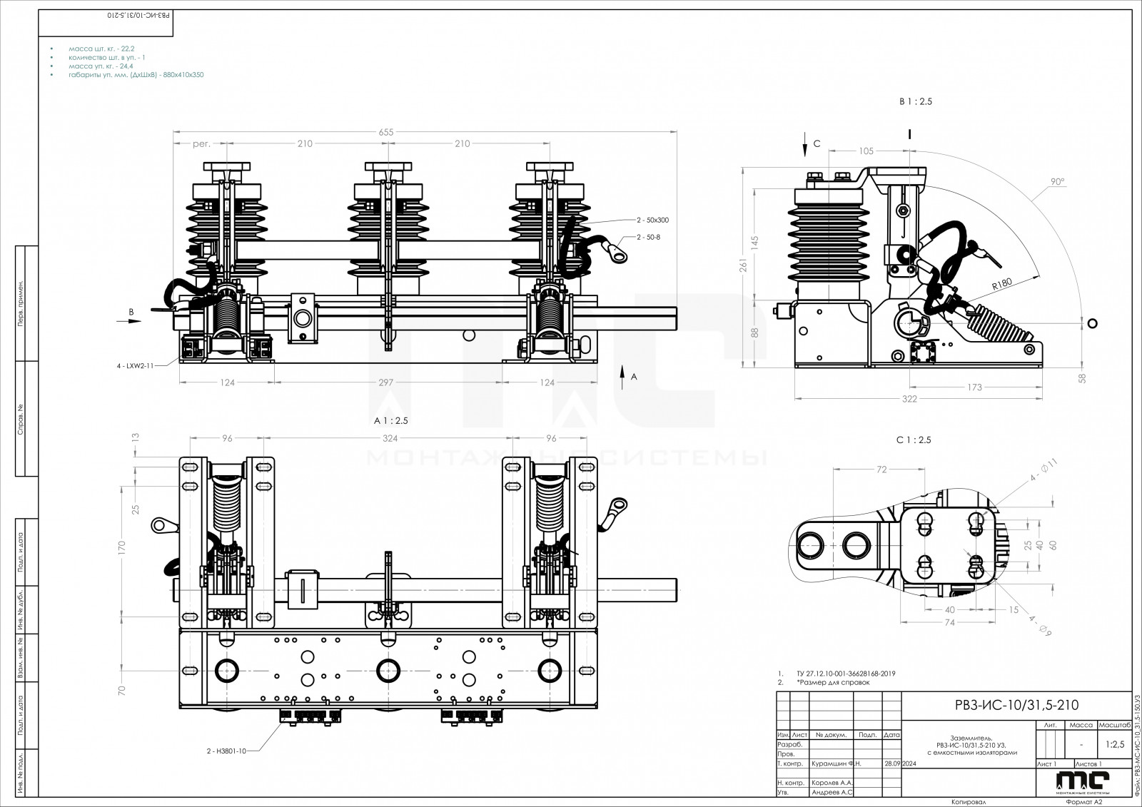 Быстродействующий заземлитель, тип: РВ3-ИС, с установленными опорными изоляторами с емкостным делителем, предназначен для работы в составе комплектных распределительных устройств, в сетях трехфазного переменного тока с частотой 50 Гц, номинальным напряжением 10 кВ, с изолированной, заземленной через дугогасительный реактор или резистор нейтралью.