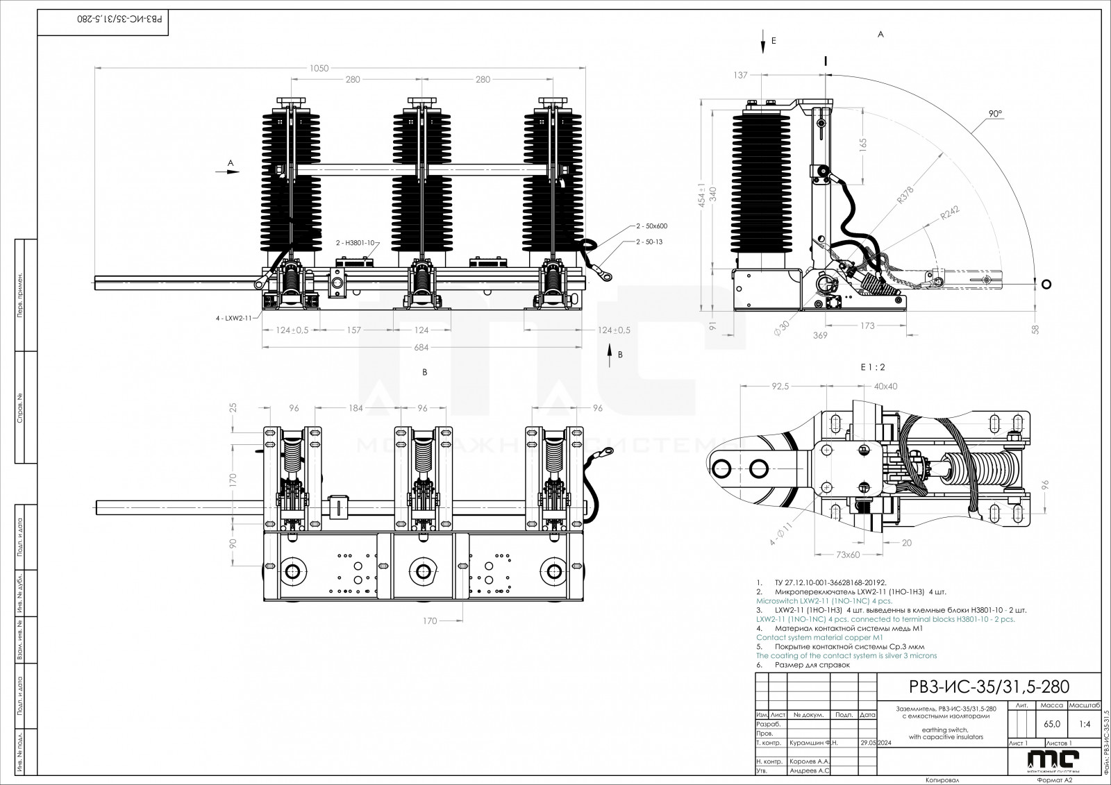 Быстродействующий заземлитель, тип: РВ3-ИС, с установленными опорными изоляторами с емкостным делителем, предназначен для работы в составе комплектных распределительных устройств, в сетях трехфазного переменного тока с частотой 50 Гц, номинальным напряжением 35 кВ, с изолированной, заземленной через дугогасительный реактор или резистор нейтралью.